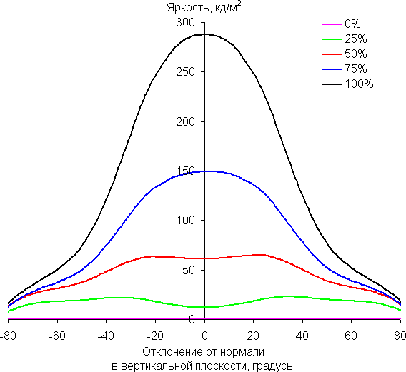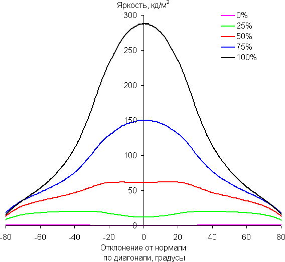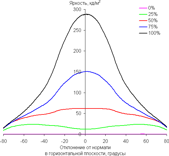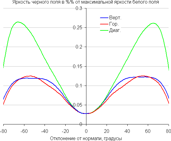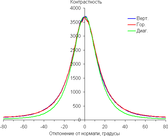 Отметим плавное, но все же относительно быстрое уменьшение яркости при отклонении от перпендикуляра к экрану во всех трех направлениях. Под очень большими углами графики яркости некоторых полутонов пересекаются, то есть яркость оттенков инвертируется, но в реальной ситуации этого видно не будет. По скорости снижения яркости углы обзора не такие узкие, как это часто бывает в случае матриц VA. Яркость черного поля при отклонении от перпендикуляра к экрану возрастает, но всего до примерно 0,26% от максимальной яркости белого поля. Это хороший результат. Контрастность в диапазоне углов ±82° не опускается ниже отметки 10:1.