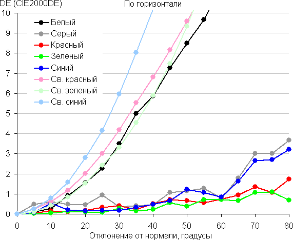 В качестве реперной точки можно выбрать отклонение в 45°. Критерием сохранения правильности цветов можно считать значение ΔE меньше 3. Из графиков следует, что при взгляде под углом основные цвета меняются несильно, но полутона изменяются существенно, что ожидаемо для матрицы типа VA* и является ее основным недостатком.