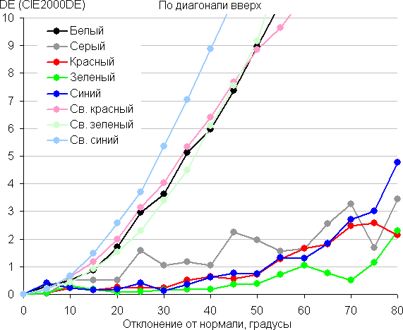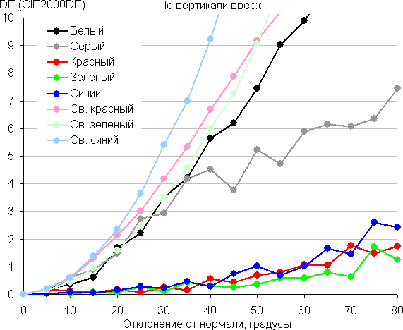 Для количественной характеристики изменения цветопередачи мы провели колориметрические измерения для белого, серого (127, 127, 127), красного, зеленого и синего, а также светло-красного, светло-зеленого и светло-синего полей во весь экран с использованием установки, подобной той, что применялась в предыдущем тесте. Измерения проводились в диапазоне углов от 0° (датчик направлен перпендикулярно к экрану) до 80° с шагом в 5°. Полученные значения интенсивностей были пересчитаны в отклонение ΔE относительно замера каждого поля при перпендикулярном положении датчика относительно экрана. Результаты представлены ниже: