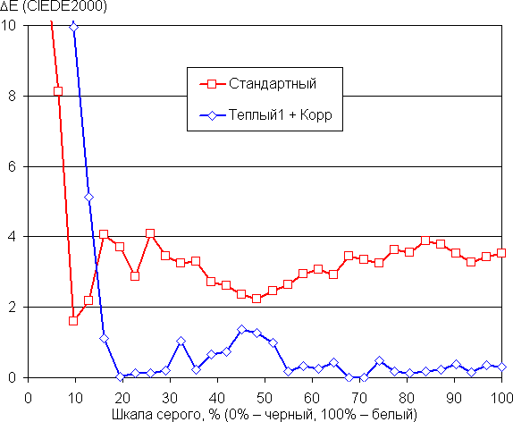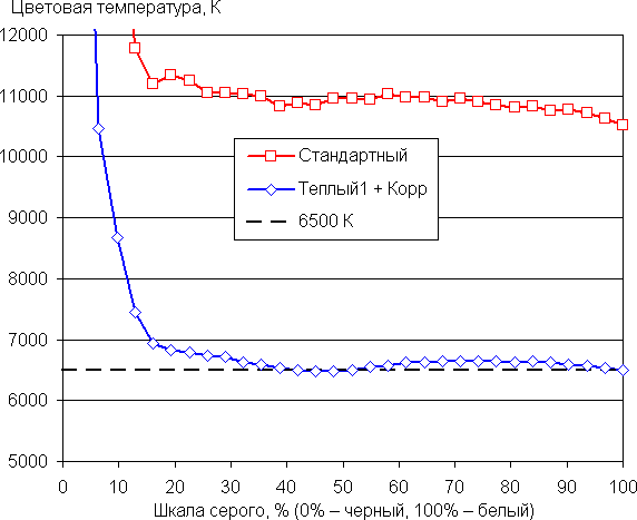 Графики ниже показывают цветовую температуру на различных участках шкалы серого и отклонение от спектра абсолютно черного тела (параметр ΔE) при выборе варианта Стандартный для настройки Оттенок (в этом случае яркость и контраст максимальные) и после коррекции цветового баланса настройками усиления трех основных цветов в случае варианта Теплый1 (значения 0, −25 и −34 для усиления красного, зеленого и синего цветов):
