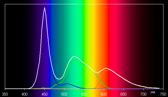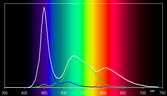 Ниже приведен спектр для белого поля (белая линия), наложенный на спектры красного, зеленого и синего полей (линии соответствующих цветов) для профиля Исходный: