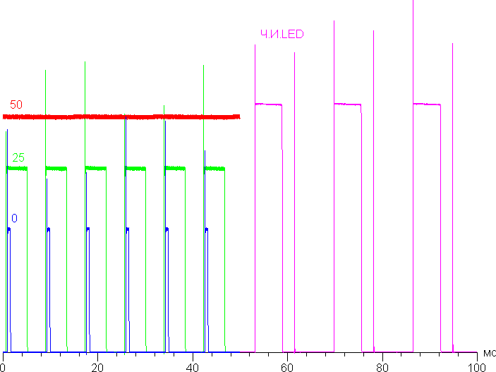 Управление яркостью свечения подсветки осуществляется с помощью ШИМ с частотой 100 или 120 Гц при 50 и 60/24 Гц частоты обновления. Однако, если выбрать режим Кино и отключить функцию вставки промежуточных кадров, то частота повышается в два раза — до 200 и 240 Гц, соответственно. Ниже приведена зависимость яркости от времени, числа — это значения настройки Подсветка (60 Гц частоты обновления, левая половина рисунка):