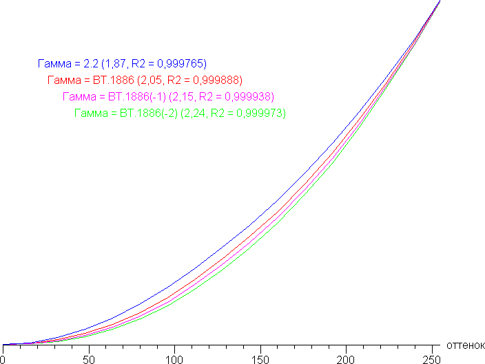 Для оценки характера роста яркости на шкале серого мы измерили яркость 17 оттенков серого при различных значениях параметра Гамма. На графике ниже приведены полученные гамма-кривые (значения показателей аппроксимирующей функции приведены в скобках в подписях, там же — коэффициент детерминации):
