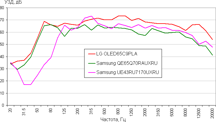 Сравним АЧХ этого ТВ с АЧХ двух телевизоров высшего класса (30 дБ — это фоновый уровень в помещении):