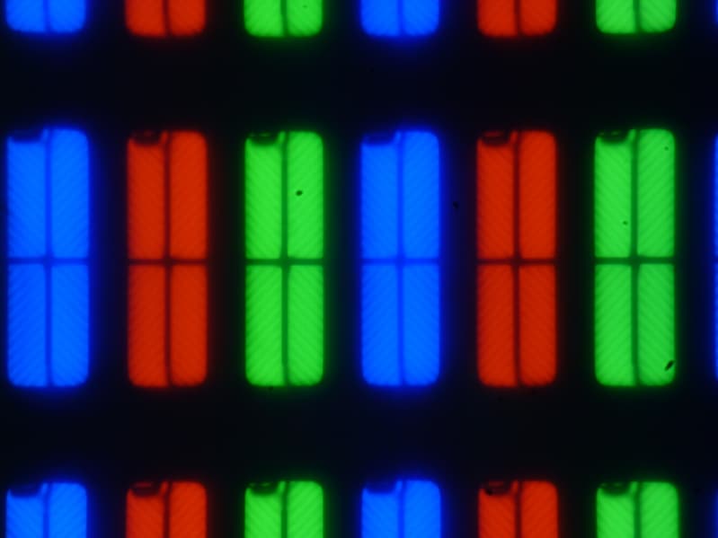 Субпиксели трех цветов (красного, зеленого и синего) поделены на четыре участка с доменами в различающейся ориентации. Такое устройство в принципе способно обеспечить хорошие углы обзора, чему способствует вариация ориентации ЖК в доменах. Отметим, что никакого «кристаллического эффекта» (микроскопической вариации яркости и оттенка) в явном виде нет, но под большими углами что-то похожее на него появляется.