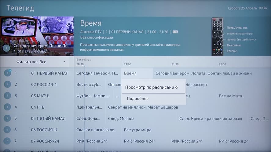 Есть хорошая поддержка электронной программы передач (если она передается) — можно посмотреть, что именно идет на текущем и других каналах, запрограммировать просмотр программы или сериала и т. д.