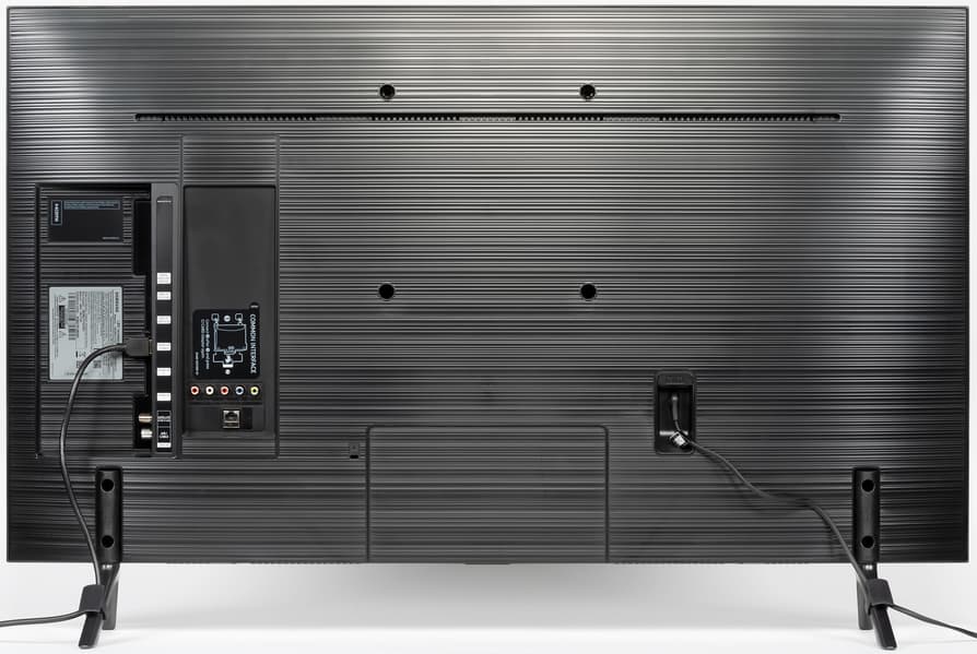 Альтернативный способ установки телевизора — это вариант крепления телевизора на VESA-кронштейне под имеющиеся на задней панели резьбовые отверстия в углах квадрата 200 на 200 мм (нужно использовать входящие в комплект поставки адаптеры-проставки). Кожух задней панели имеет рельеф в виде мелких горизонтальных канавок с переменной шириной.