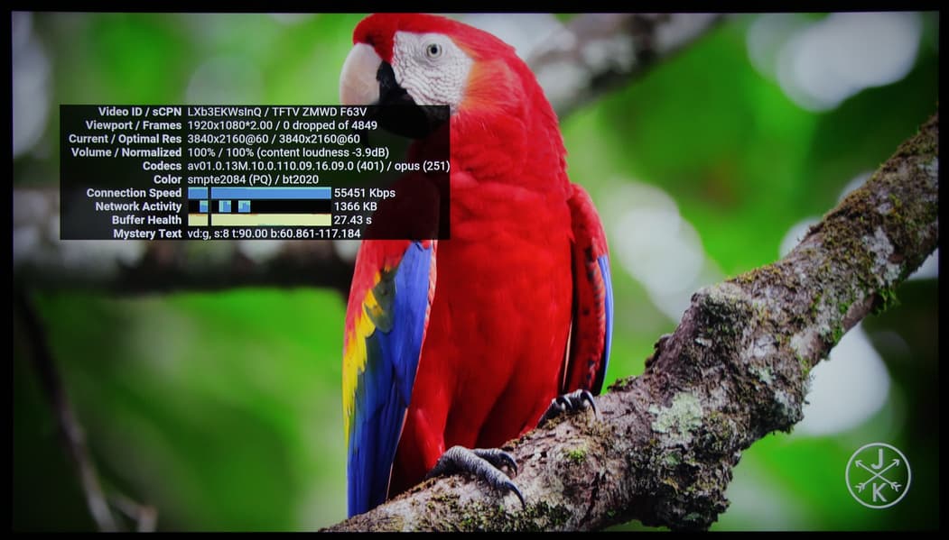 Тестовые ролики на определение равномерности чередования кадров помогли выявить, что телевизор при воспроизведении видеофайлов подстраивает частоту обновления экрана под частоту кадров в видеофайле, но только на 50 или 60 Гц, поэтому файлы с 24 кадр/с воспроизводятся с чередованием длительности кадров 2:3. В стандартном для видео диапазоне (16—235) отображаются все градации оттенков. Максимальный битрейт видеофайлов, при котором еще не было артефактов, при воспроизведении с USB-носителей составил 180 Мбит/с (H.264, http://jell.yfish.us/), по Wi-Fi (сеть в диапазоне 5 ГГц) — 200 Мбит/с, по проводной сети Ethernet — 90 Мбит/с. В последних двух случаях использовался медиасервер роутера Asus RT-AC68U. Статистика на роутере показывает, что по Wi-Fi скорость приема/передачи составляет 866,7 Мбит/с, то есть в телевизоре установлен адаптер 802.11ac.