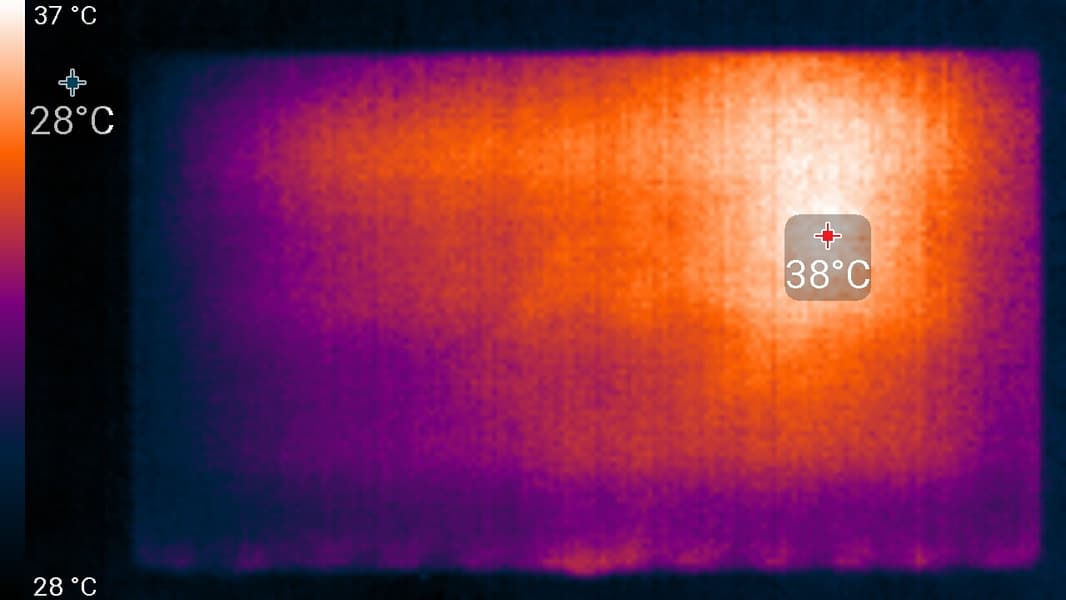 Нагрев телевизора спереди можно оценить по приведенному снимку с ИК-камеры, полученному после долговременной работы на максимальной яркости в помещении с температурой примерно 24 °C: