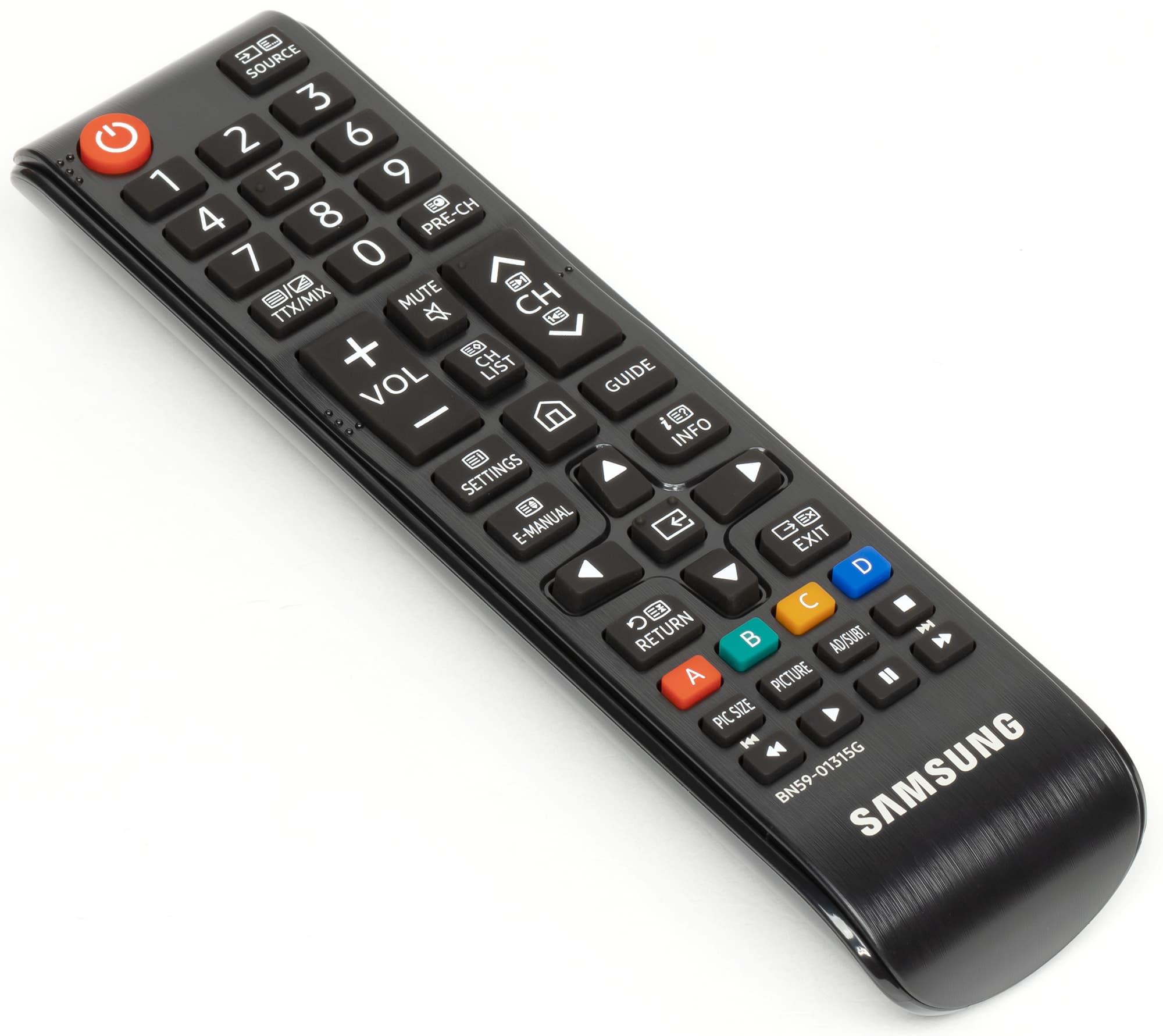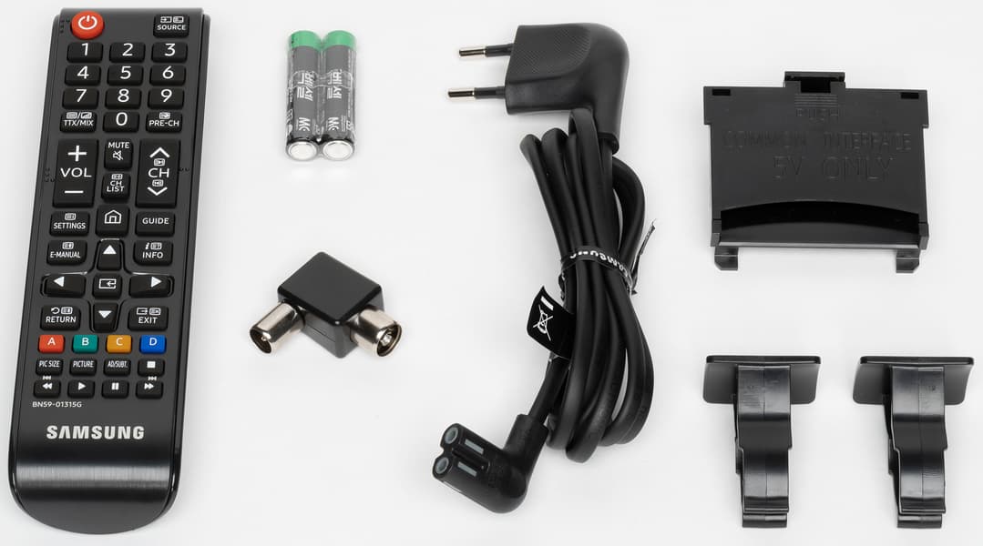 Корпус пульта изготовлен из черного пластика с матовой поверхностью, а кнопки — из резиноподобного материала. Пульт удобно лежит в руке. В отличие от топовых серий ТВ Samsung на пульте к этому телевизору кнопок много. Их обозначения контрастные, но некоторые уж слишком мелкие и трудночитаемые, да и ряд самих кнопок тоже слишком мелкие и расположены очень тесно. Есть две кнопки-качалки изменения громкости и переключения ТВ-каналов, которые легко находятся на ощупь. Подсветки, конечно, нет. Работает пульт по ИК. Есть возможность настроить этот пульт на управление другой аудио- и видеотехникой, но для управления сторонней техникой используются передача команд с помощью ИК-излучателей на самом ТВ, что снижает ценность данной функции почти до нуля, так как подключенная к ТВ техника редко находится перед телевизором.