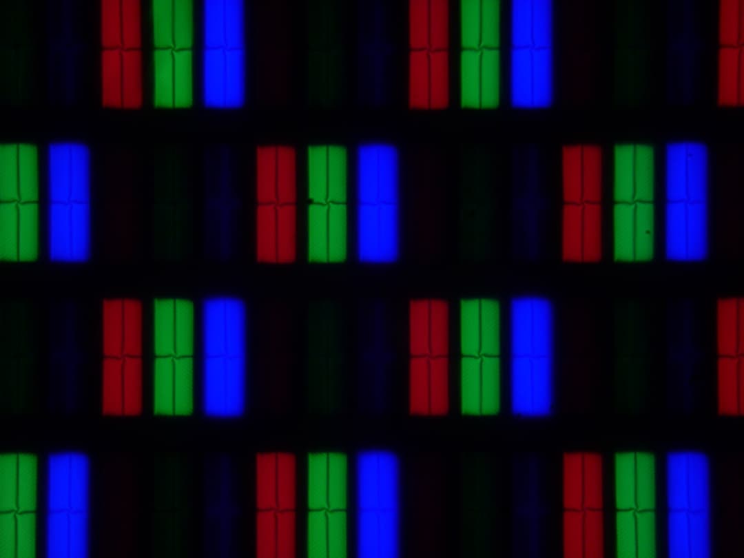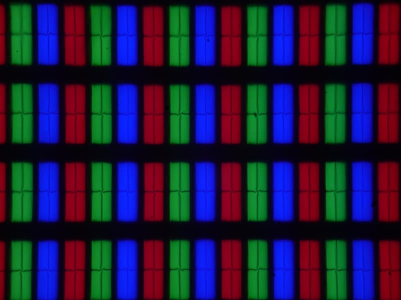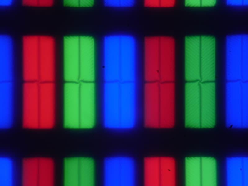 Субпиксели трех цветов (красного, зеленого и синего) поделены на четыре участка с доменами в различающейся ориентации. Такое устройство в принципе способно обеспечить хорошие углы обзора, чему способствует вариация ориентации ЖК в доменах. Отметим, что никакого «кристаллического эффекта» (микроскопической вариации яркости и оттенка) в явном виде нет.