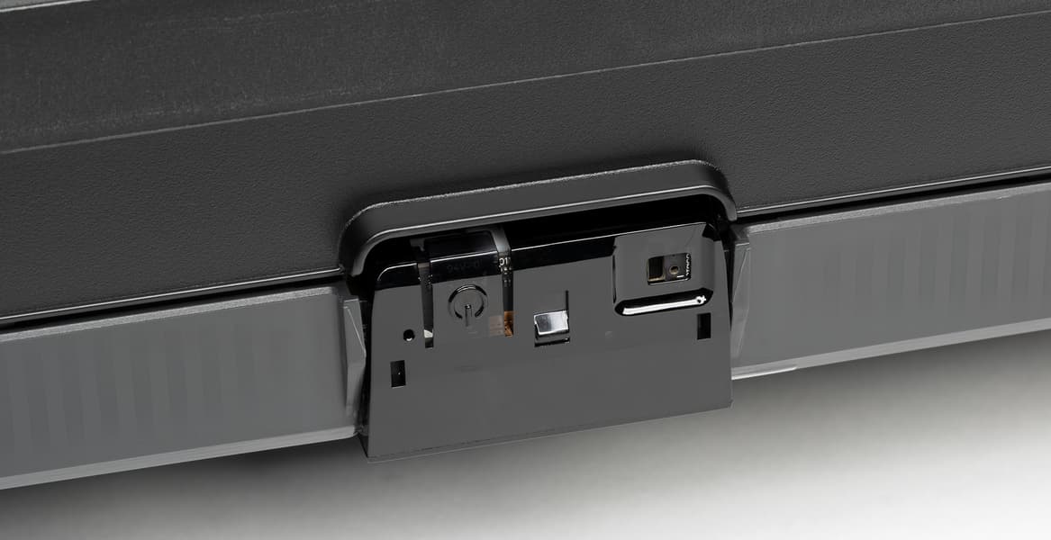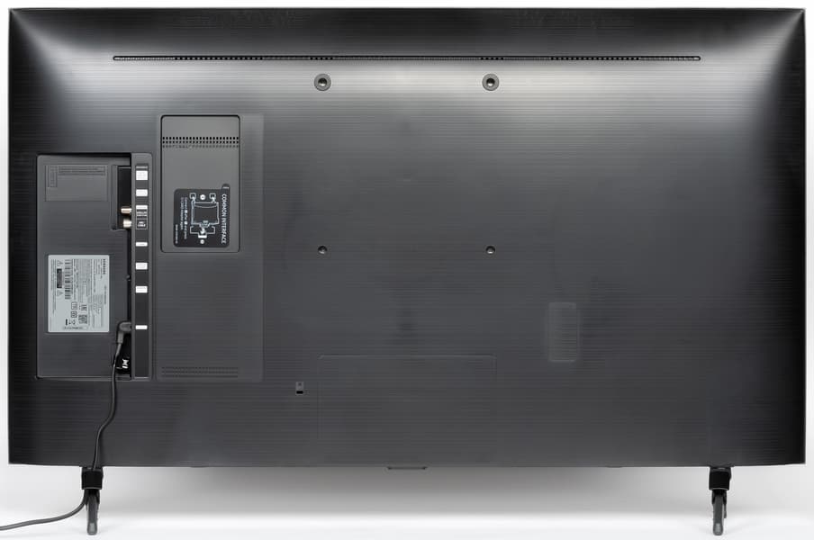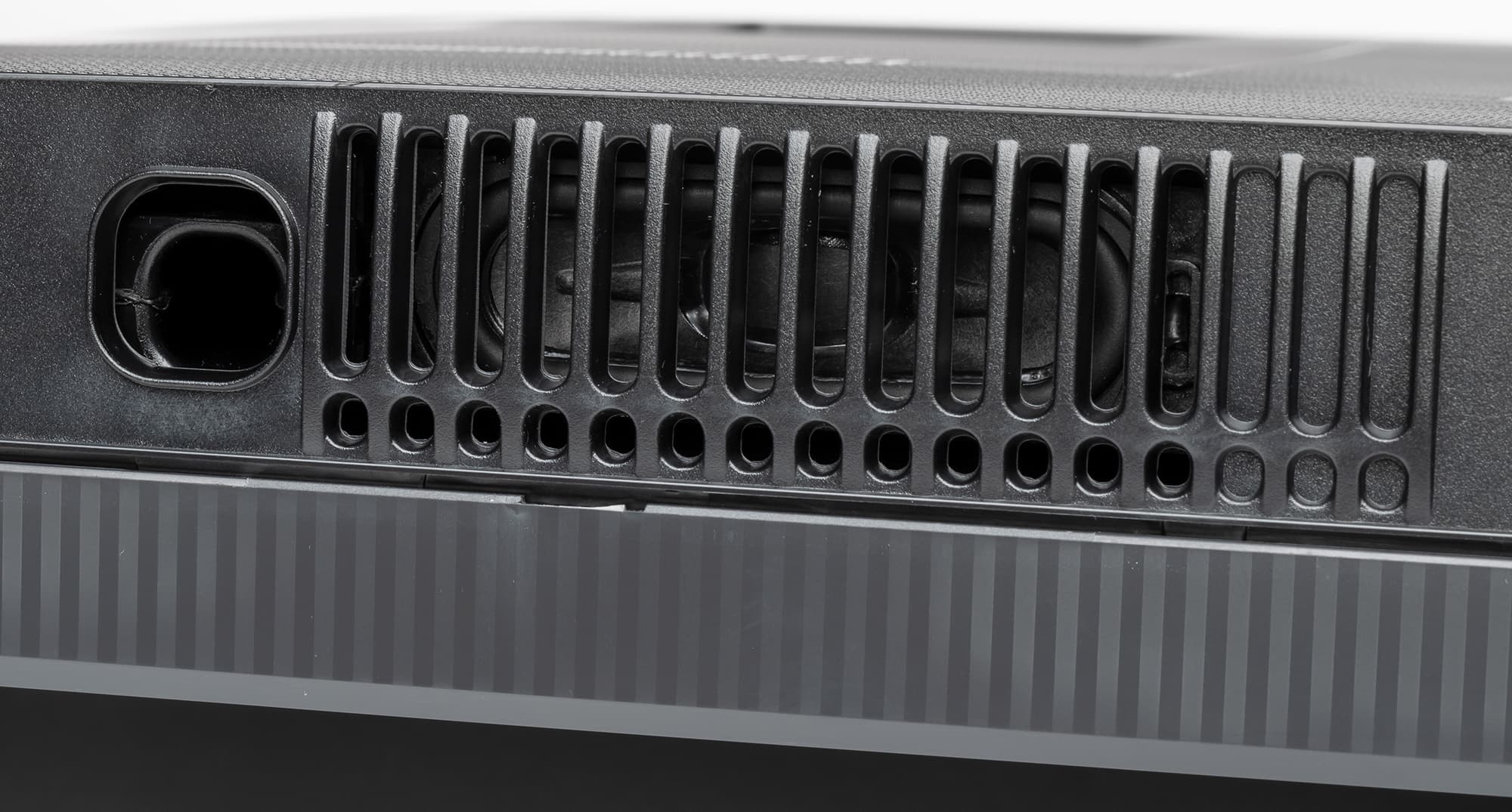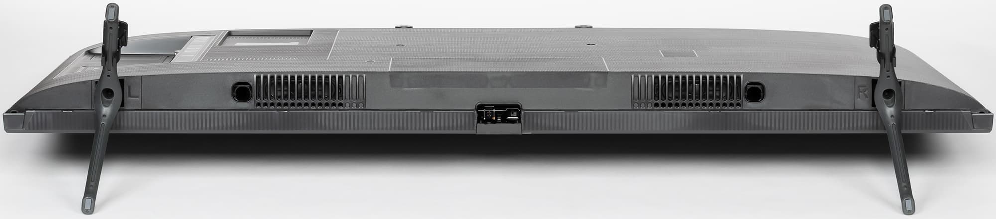 Телевизор имеет полностью пассивное охлаждение. За решетками на нижнем торце расположены встроенные громкоговорители с вытянутыми диффузорами. Рядом с ними находится по отверстию фазоинвертора.