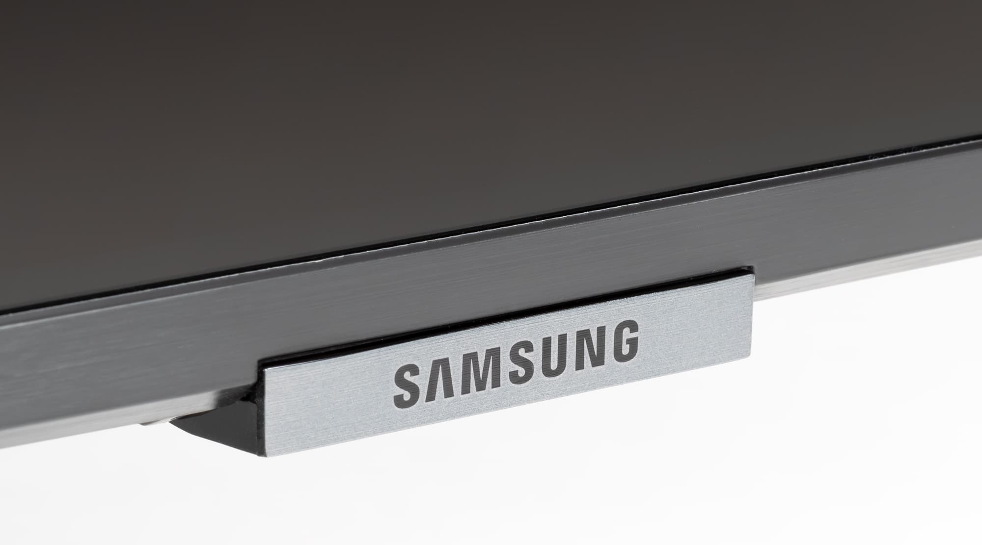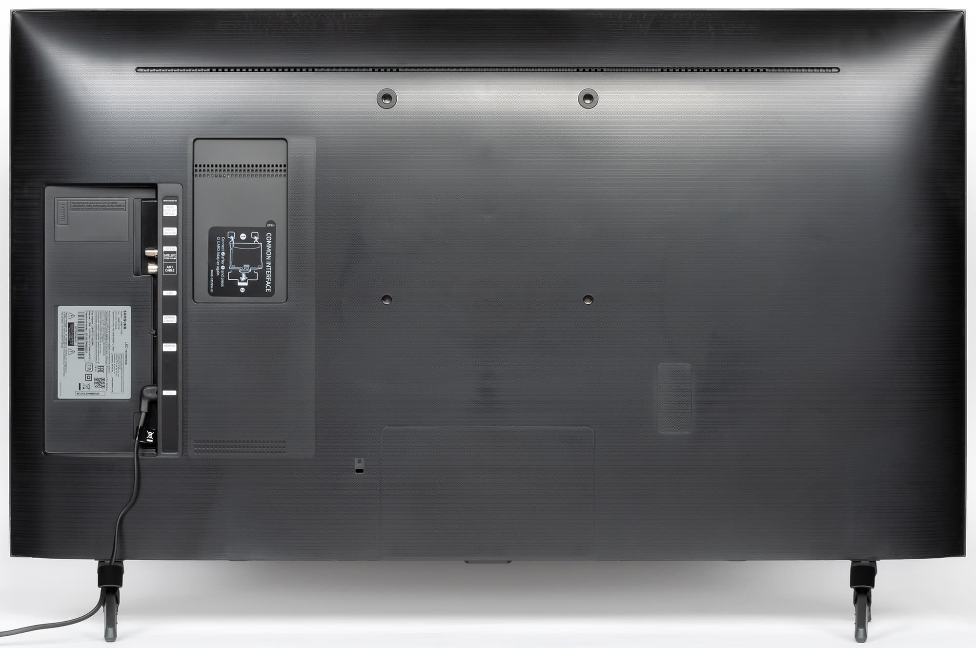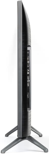 Подставка выполнена в виде двух Y-образных ножек, вставляющихся в гнезда на нижнем торце. Опираются ножки на резиновые накладки. Расстояние между ножками 79 см. Сзади на каждую из ножек можно нащелкнуть кабельный фиксатор, чтобы кабели спускались назад по ножкам и не ухудшали вид телевизора спереди и сзади. Стоит телевизор устойчиво, жесткость конструкции подставки достаточная. Телевизор, установленный на горизонтальную поверхность на штатную подставку, стоит вертикально без видимого наклона.