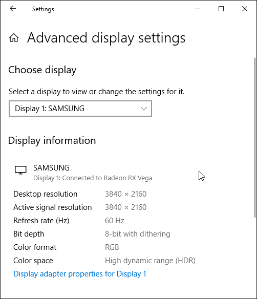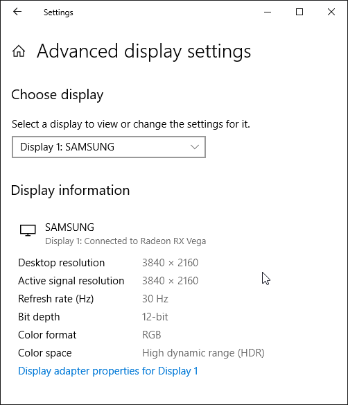 Под Windows 10 вывод в режиме HDR на данный телевизор возможен при выборе соответствующих опций в настройках дисплея. При разрешении 4К и 60 Гц вывод идет в режиме 8 бит на цвет, дополненных динамическим смешением цветов, видимо, с помощью видеокарты на аппаратном уровне. При 30 Гц — 12 бит на цвет (динамическое расширение до 10 бит выполняется уже самим ТВ):