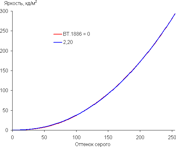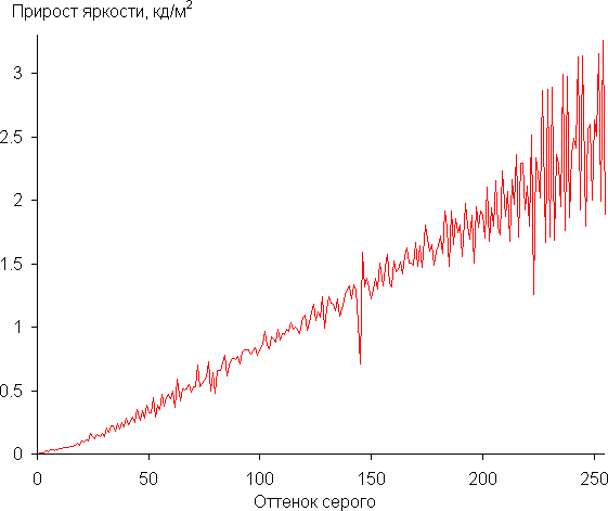 Для оценки характера роста яркости мы измерили яркость 256 оттенков серого (от 0, 0, 0 до 255, 255, 255) при подключении к ПК в режиме RGB при 3840×2160 и 60 Гц, параметр Гамма в настройках ТВ — BT.1886 = 0, Контраст = 50. График ниже показывает прирост (не абсолютное значение!) яркости между соседними полутонами: