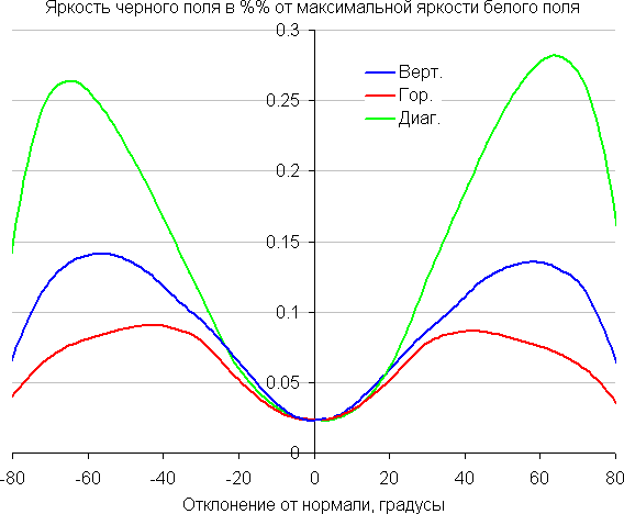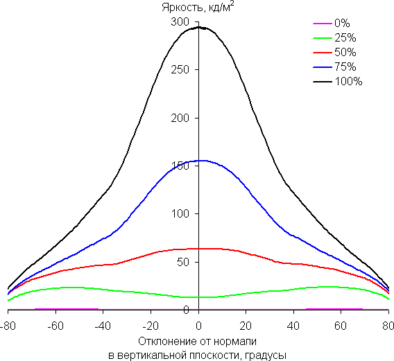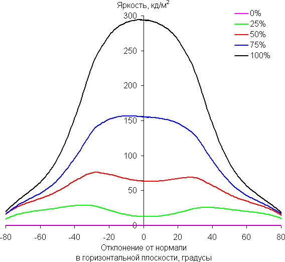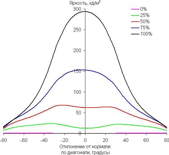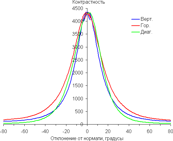 Отметим плавное, но все же относительно быстрое уменьшение яркости при отклонении от перпендикуляра к экрану в вертикальном направлении. В горизонтальном направлении снижение яркости не такое быстрое, а в диагональном — промежуточный вариант. Под очень большими углами графики яркости некоторых полутонов пересекаются, то есть яркость оттенков инвертируется, но в реальной ситуации этого видно не будет. Яркость черного поля при отклонении от перпендикуляра к экрану возрастает, но всего до примерно 0,28% максимум от максимальной яркости белого поля. Это хороший результат. Контрастность в диапазоне углов ±82° не опускается ниже отметки 10:1.