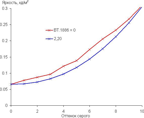 Рост прироста яркости более-менее равномерный, и каждый следующий оттенок значимо ярче предыдущего, даже в самой темной области: