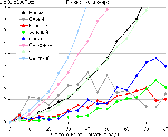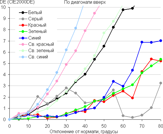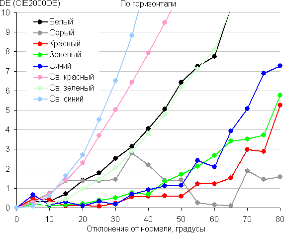 Для количественной характеристики изменения цветопередачи мы провели колориметрические измерения для белого, серого (127, 127, 127), красного, зеленого и синего, а также светло-красного, светло-зеленого и светло-синего полей во весь экран с использованием установки, подобной той, что применялась в предыдущем тесте. Измерения проводились в диапазоне углов от 0° (датчик направлен перпендикулярно к экрану) до 80° с шагом в 5°. Полученные значения интенсивностей были пересчитаны в отклонение ΔE относительно замера каждого поля при перпендикулярном положении датчика относительно экрана. Результаты представлены ниже: