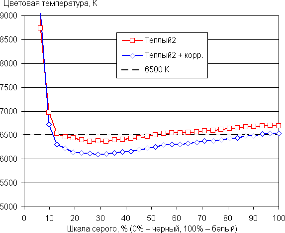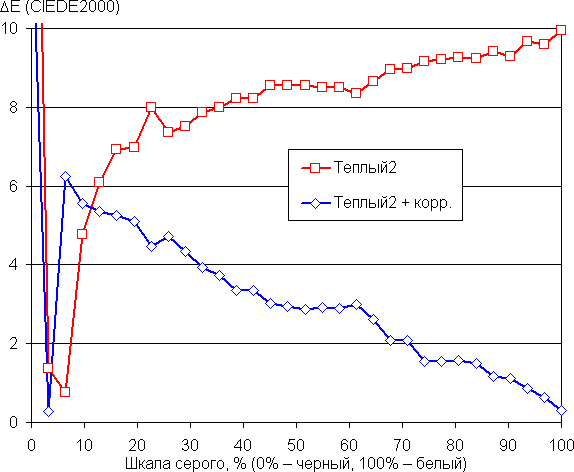 Графики ниже показывают цветовую температуру на различных участках шкалы серого и отклонение от спектра абсолютно черного тела (параметр ΔE) при выборе варианта Теплый2 для настройки Оттенок и после коррекции цветового баланса настройками усиления трех основных цветов также в случае варианта Теплый2 (значения −19, −8 и 0 для усиления красного, зеленого и синего цветов):