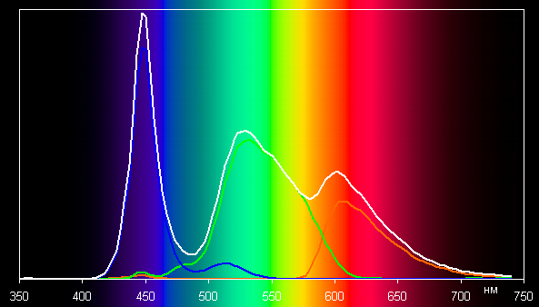 Ниже приведен спектр для белого поля (белая линия), наложенный на спектры красного, зеленого и синего полей (линии соответствующих цветов) для профиля Исходный: