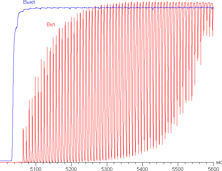 Есть функция динамической регулировки яркости подсветки. При ее включении яркость быстро снижается на темных изображениях и на черном поле во весь экран подсветка отключается совсем. При смене темных изображений на светлые яркость подсветки быстро повышается. Особой пользы от этой функции нет, так как контрастность и так высокая, а вот постоянная смена яркости очень раздражает. Впрочем, в режиме подключения к ПК от этого можно избавиться. График ниже показывает, как меняется яркость (вертикальная ось) при переключении с черного поля на белое при включенной и выключенной функции динамической регулировки яркости подсветки: