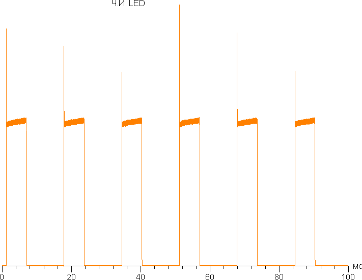 Управление яркостью свечения подсветки осуществляется с помощью ШИМ с частотой 100 ГЦ (при 50 Гц частоты обновления) или 120 Гц (при 60/24 Гц частоты обновления). Ниже приведена зависимость яркости от времени, числа — это значения настройки Яркость (частота обновления 60 Гц):