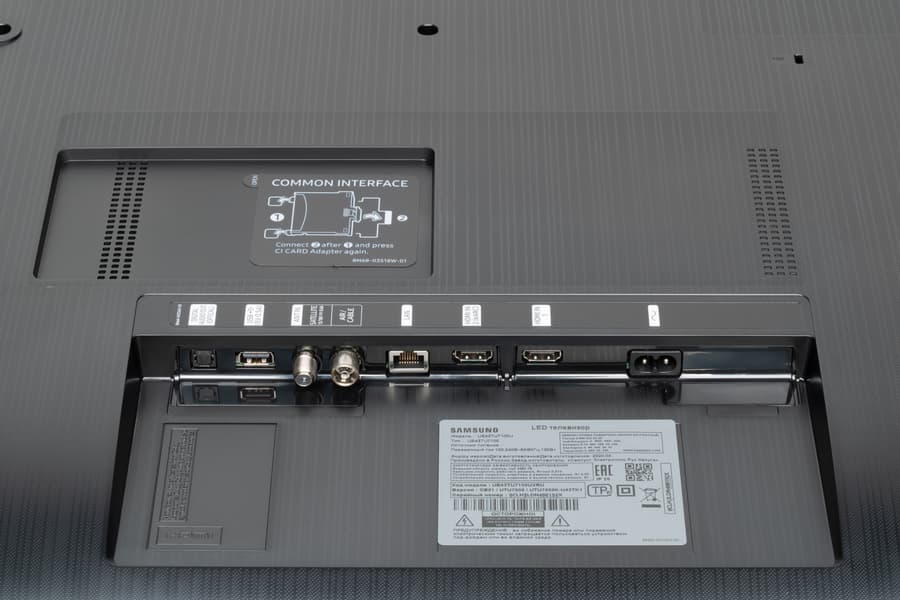 Основные интерфейсные разъемы и разъем питания размещены в нише на задней панели и направлены вбок. Подключать кабели к разъемам относительно удобно. В отдельной неглубокой нише есть разъем для адаптера карты CI, закрытый наклейкой с инструкцией по установке этого адаптера.