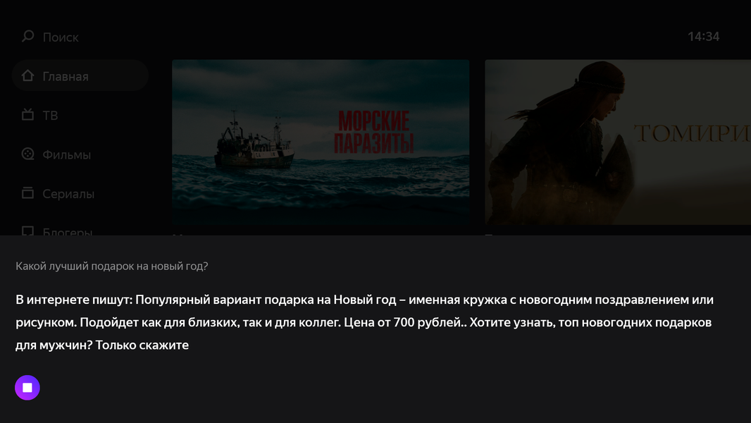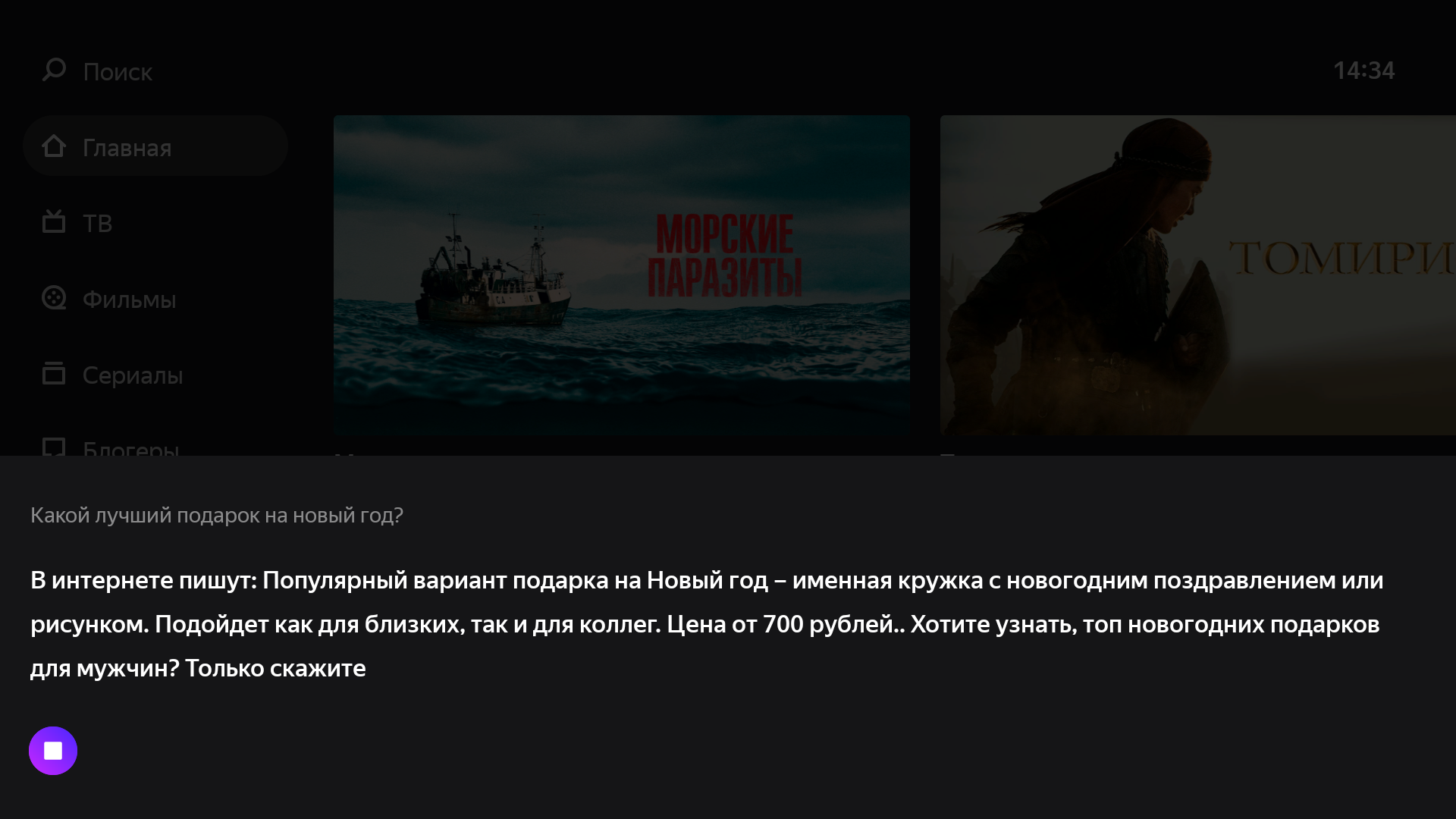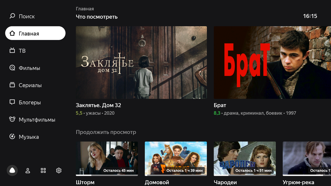 Пункты Фильмы, Сериалы, Блогеры, Мультфильмы и Музыка позволяют выбрать соответствующий контент дополнительно разбитый на категории. А если оставаться на главной странице, то пользователь увидит рекомендованный контент, список того, что можно продолжить смотреть, список последних использованных приложений, и очень длинный список с рекомендованным контентом, также разбитый на категории. В нижней части домашней страницы расположены значки для вывода краткой справки по работе с Алисой, для перехода к работе с аккаунтами, для вывода списка приложений и для перехода к настройкам.