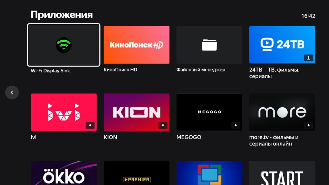 Даже приложения YouTube в явном виде нет (оно есть только в виде веб-версии для Smart TV, и запускается, например, из поисковой выдачи). Магазин приложений также отсутствует. Впрочем, пользователю предлагается список из прямых ссылок, позволяющих установить нескольких популярных приложений. Также приложения, в том числе сторонние магазины, можно установить из файлов APK. Эти файлы, как и, например, фильмы, фотографии и музыку можно записать на USB-носитель, чтобы затем установить или воспроизвести их на телевизоре с помощью уже установленного Файлового менеджера. Впрочем, концепция платформы Яндекс.ТВ предполагает, что пользователь весь необходимый ему контент будет получать непосредственно с домашней страницы телевизора, по необходимости используя Алису в качестве советчика, а потому особой надобности в использовании сторонних приложений нет.