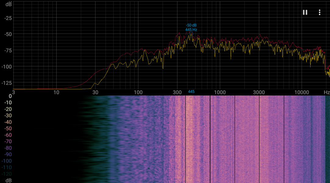 Спектрограмма белого шума также показала наличие резонансных пиков в области средних частот: