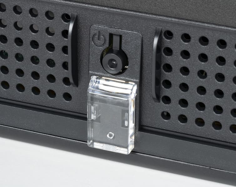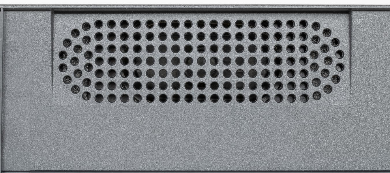 На пластиковом кожухе сзади, сверху и снизу есть вентиляционные решетки. За решетками на нижнем торце можно разглядеть пару громкоговорителей с вытянутыми диффузорами.