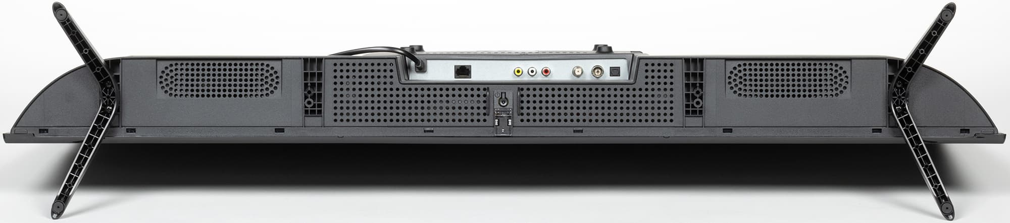 Задняя панель условно в верхней части изготовлена из тонкого листа стали и имеет стойкое черное матовое покрытие. Выступающий назад кожух в нижней части с заходом на нижний торец изготовлен из черного пластика с матовой поверхностью. Интерфейсные разъемы размещены в двух незамкнутых нишах. Часть разъемов направлена вниз, часть вбок. Спереди дотягиваться до разъемов, даже направленных вбок, неудобно. Подключать кабели к разъемам, направленным вниз, еще сложнее. Даже верхней части телевизор не тонкий.