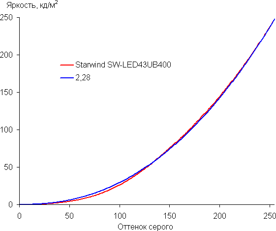 Для оценки характера роста яркости на шкале серого мы измерили яркость 17 оттенков серого при различных значениях параметра Гамма. На графике ниже приведены полученные гамма-кривые (значения показателей аппроксимирующей функции приведены в скобках в подписях, там же — коэффициент детерминации):