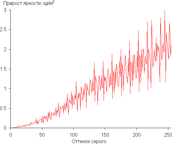 Реальная гамма-кривая ближе к стандартной в случае варианта Темный, поэтому далее мы измерили яркость 256 оттенков серого (от 0, 0, 0 до 255, 255, 255) при этом значении (снизив значение настройки Контраст до 48, чтобы в светах не было завала на один оттенок и увеличив настройку Яркость до 52, чтобы не было завала в тенях). График ниже показывает прирост (не абсолютное значение!) яркости между соседними полутонами: