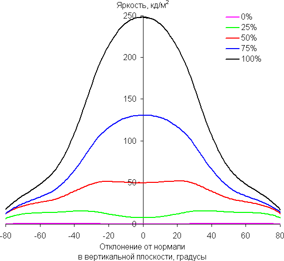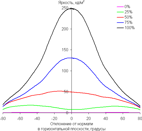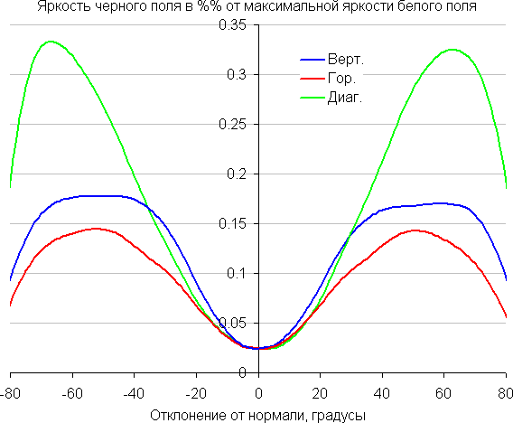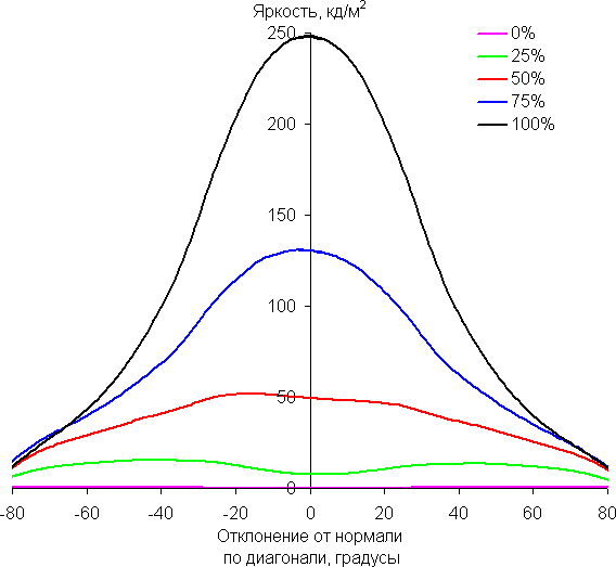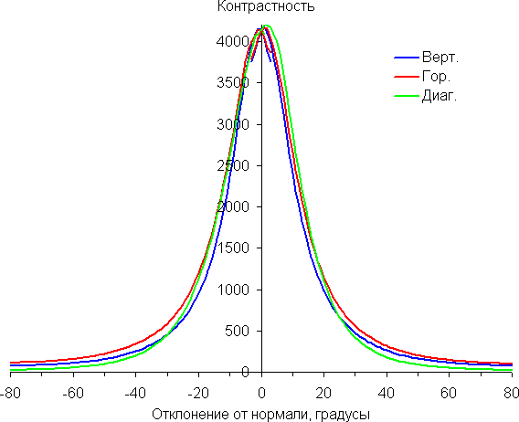 По скорости снижения яркости углы обзора не очень широкие. Яркость черного поля при отклонении от перпендикуляра к экрану возрастает, но всего до примерно 0,35% от максимальной яркости белого поля и только при большом отклонении. Это хороший результат. Контрастность в диапазоне углов ±82° для двух направлений значительно превышает 10:1 и только для диагонального направления она ниже, но все равно не опускается за эту отметку.