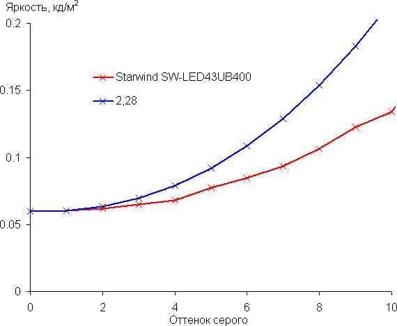 Рост прироста яркости более-менее равномерный, и каждый следующий оттенок значимо ярче предыдущего, даже в самой темной области: