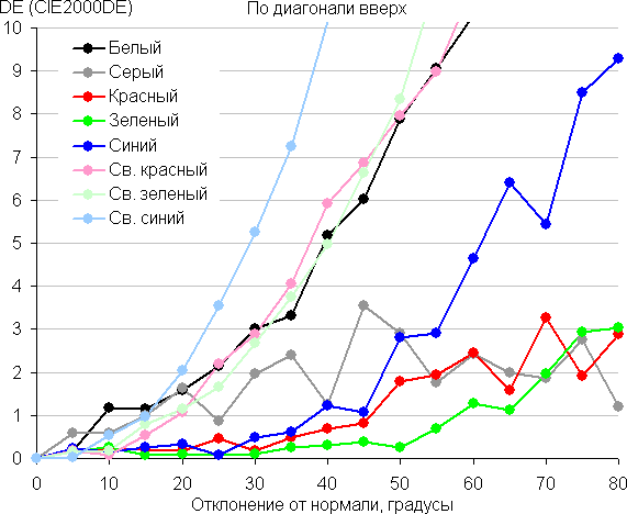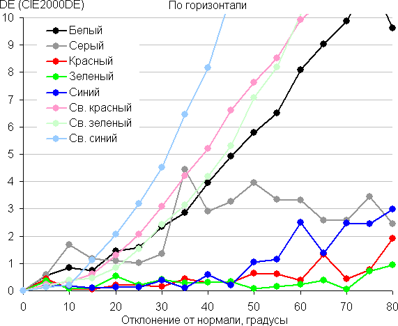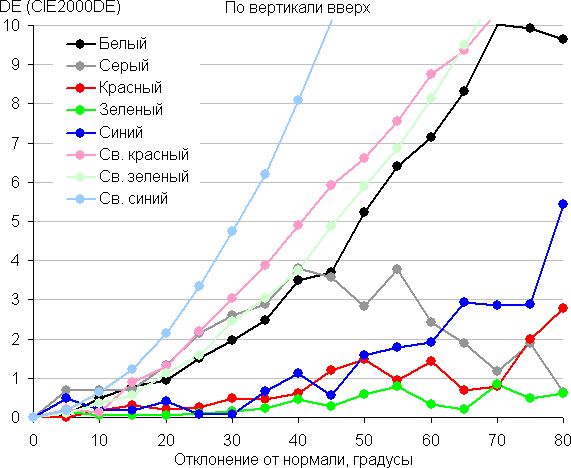 Для количественной характеристики изменения цветопередачи мы провели колориметрические измерения для белого, серого (127, 127, 127), красного, зеленого и синего, а также светло-красного, светло-зеленого и светло-синего полей во весь экран с использованием установки, подобной той, что применялась в предыдущем тесте. Измерения проводились в диапазоне углов от 0° (датчик направлен перпендикулярно к экрану) до 80° с шагом в 5°. Полученные значения интенсивностей были пересчитаны в отклонение ΔE относительно замера каждого поля при перпендикулярном положении датчика относительно экрана. Результаты представлены ниже: