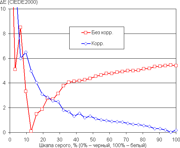 Графики ниже показывают цветовую температуру на различных участках шкалы серого и отклонение от спектра абсолютно черного тела (параметр ΔE) просто при выборе варианта Пользовательский (самый яркий режим — Без корр.) для настройки Цветовая температура и после коррекции цветового баланса настройками усиления трех основных цветов (значения 0, −9 и −34 для усиления красного, зеленого и синего цветов):