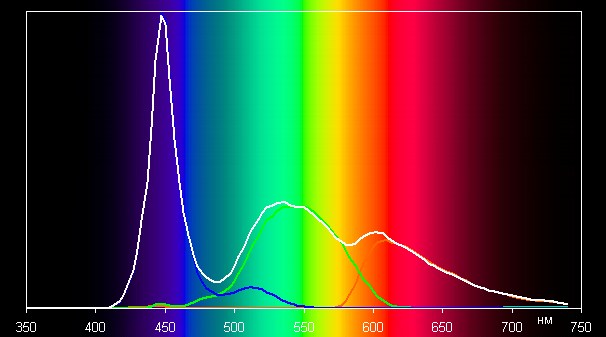 Такой спектр с относительно узким пиком синего и с широкими горбами зеленого и красного цветов характерен для ЖК-матриц, в которых используется белая светодиодная подсветка с синим излучателем и желтым люминофором.