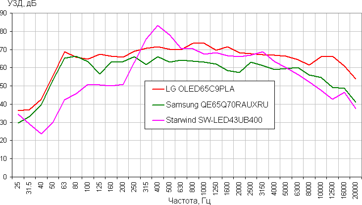 Громкость встроенной акустической системы для жилой комнаты, соответствующей по размерам данной диагонали экрана, достаточная. Стереофонический эффект есть. Присутствуют высокие и средние частоты, низких — практически нет. Явно есть паразитные резонансы корпуса. В целом даже для класса встроенной в телевизор акустики ее качество среднее. Сравним АЧХ этого ТВ с АЧХ двух телевизоров высшего класса (получена с помощью шумомера при воспроизведении звукового файла с розовым шумом, интервал УЗД в 1/3 октавах):