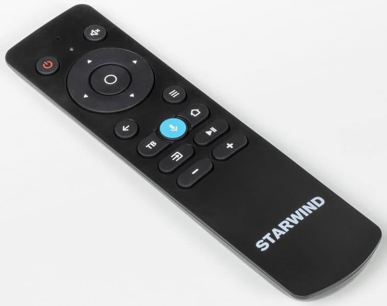 Корпус пульта изготовлен из черного пластика с матовой поверхностью. Обозначения кнопок достаточно контрастные и крупные. Самих кнопок немного, но организация интерфейса и не очень богатая функциональная оснащенность не дают особого повода сожалеть об отсутствии дополнительных кнопок. Пульт гибридный, он может работать как по ИК, так и по Bluetooth. Индикатор в передней части пульта мигает красным в первом случае и зеленым — во втором. По ИК пульт работает до сопряжения с телевизором или тогда, когда телевизор находится в режиме ожидания или в глубоком сне. Во всех остальных случаях ИК-передатчик не работает, и команды передаются по Bluetooth. В передней части пульта рядом с индикатором есть отверстие микрофона.