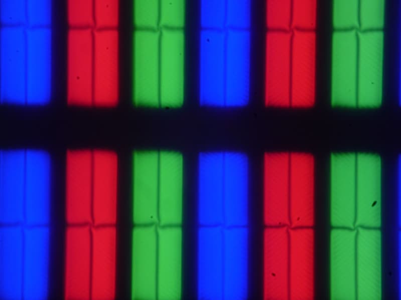 Выявленные характеристики экрана позволяют предположить, что в данном телевизоре установлена матрица типа *VA. Микрофотографии не противоречат этому (черные точки — это пыль на матрице фотоаппарата):