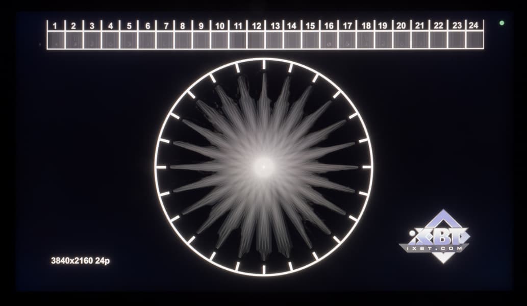 В более сложном тесте многозонная система подсветки телевизора TCL показывает себя хорошо, но не идеально. Есть характерные утечки света на области, которые должны (в идеализированном варианте) оставаться черными. Учитывая площадь экрана почти в 20000 см² и 5184 зон локального затемнения, выходит, что 1 зона покрывает площадь в 3,8 см², или, предположив, что это квадрат, почти 2×2 см. Для топового представителя TCL, даже в середине 2024 года, это крайне достойный результат. Почти никто из конкурентов на такое не способен. Так что тут есть над чем задуматься.