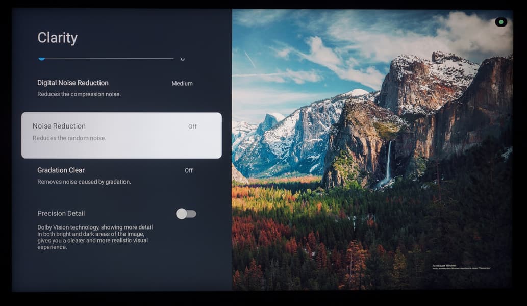 В третьем — Clarity — спрятаны настройки резкости (лучше всегда держать на нуле), цифровое подавление шумов, подавление случайного (Random) шума, снижение шума на плавных переходах и некая функция Dolby Precision Detail, которая может быть активирована только при просмотре соответствующего контента.