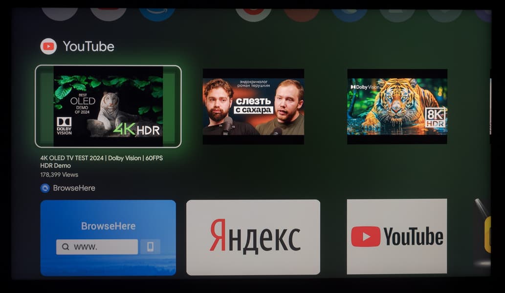 В ряде программ работает голосовой ввод текста. Также есть базовая интеграция с самим ТВ, например голосом можно менять громкость, выключать/включать звук, открывать меню с настройками, выбирать нужный вход и запускать программу по ее названию (но лишь если вы правильно ее назовете, без излишнего акцента). Еще можно вывести на экран программу телепередач и переключиться на ТВ-канал по его названию.