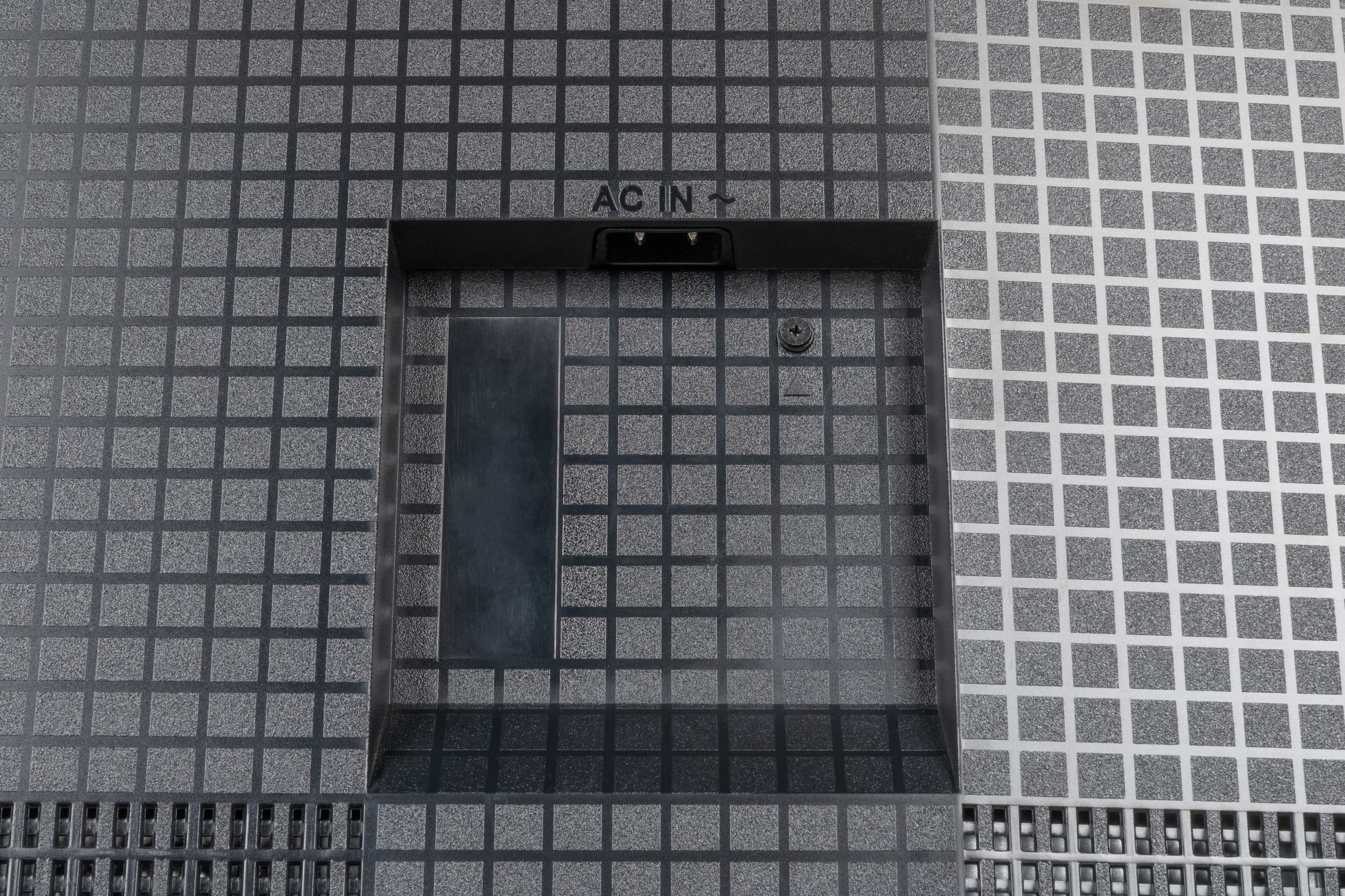 Сзади телевизор выглядит крайне аккуратно. Практически вся задняя панель изготовлена из качественного толстого пластика с фактурным рисунком в виде вертикально выстроенных прямоугольников на более темной серой подложке. Сверху есть переход к пластиковой накладке с имитацией шлифованного металла, которая визуально добавляет продукта изысканности.