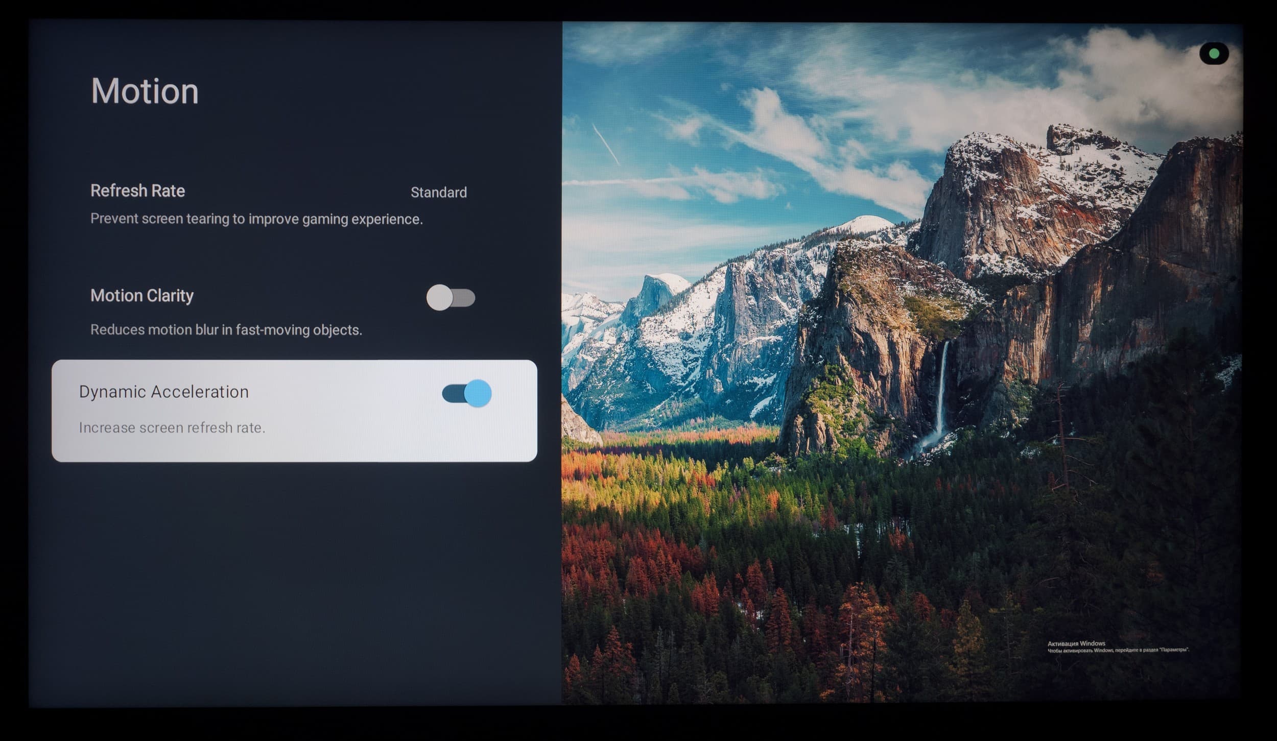 Широкий список настроек представлен и в разделе Motion. В нем можно выбрать рабочий диапазон частоты обновления (два варианта на выбор), включить системы «вставки черного кадра» и генерации дополнительных кадров (аналог MEMC), вручную настроить пару пунктов для снижения видимости размытия, активировать функцию повышения частоты обновления Dynamic Acceleration (должна увеличивать частоту вдвое вместе со снижением рабочего разрешения, но фактически этого не делает — либо делает не везде).