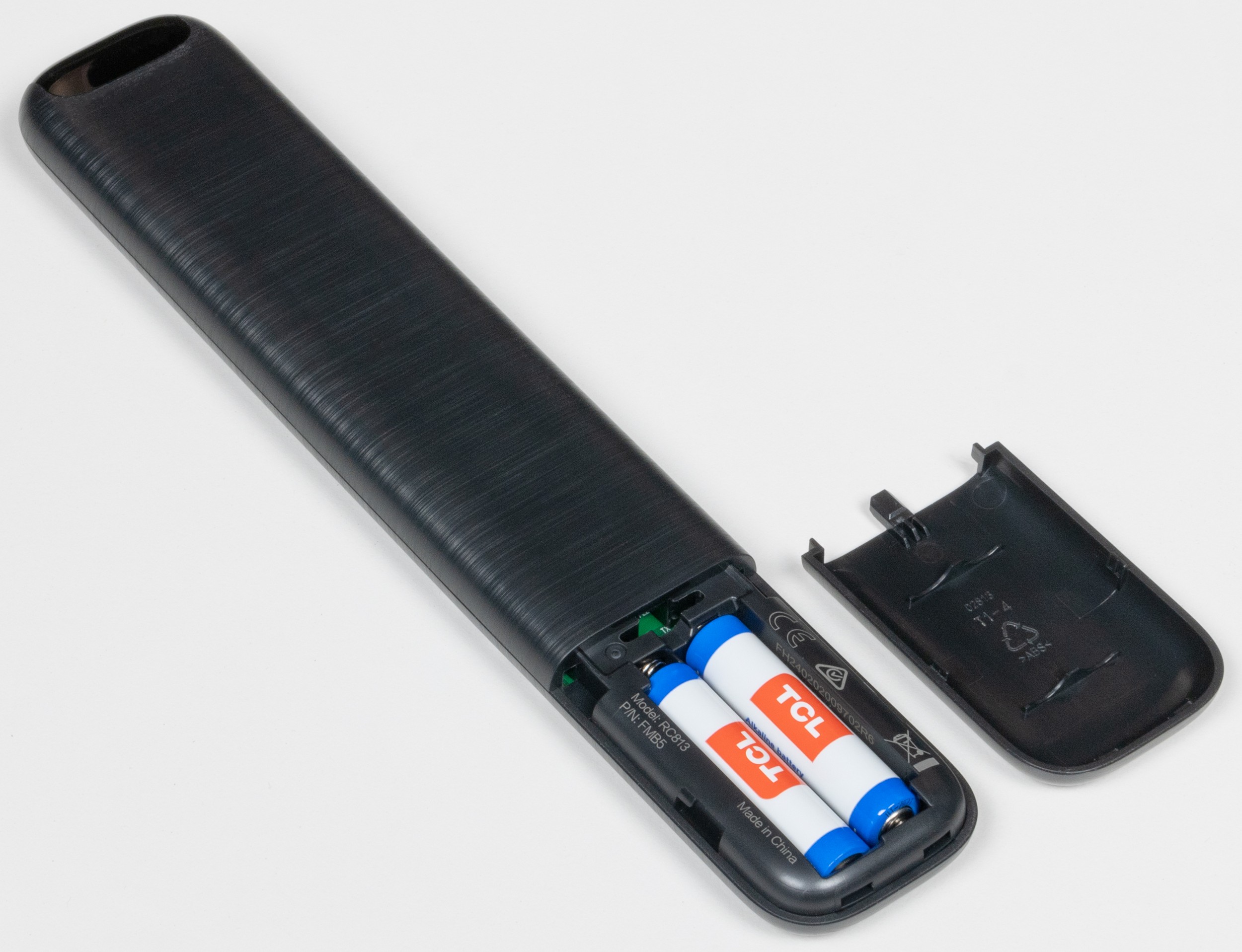 Основным элементом управления телевизора TCL 85X955 выступает крупный пульт ДУ. Он изготовлен из черного пластика с полуматовой поверхностью и текстурой под шлифованный металл. Кнопки белого и черного цветов изготовлены из резиноподобного материала. Обозначения кнопок контрастные, основные кнопки достаточно крупные, как и надписи на них. Есть несколько рядов вспомогательных кнопок, две качельки, отвечающие за регулировку громкости и переключение каналов и три крупные клавиши быстрого доступа к известным российским сервисам и собственному приложению TCL для просмотра IP TV — максимально правильный выбор компании для официально поставляемого на территорию РФ телевизора.