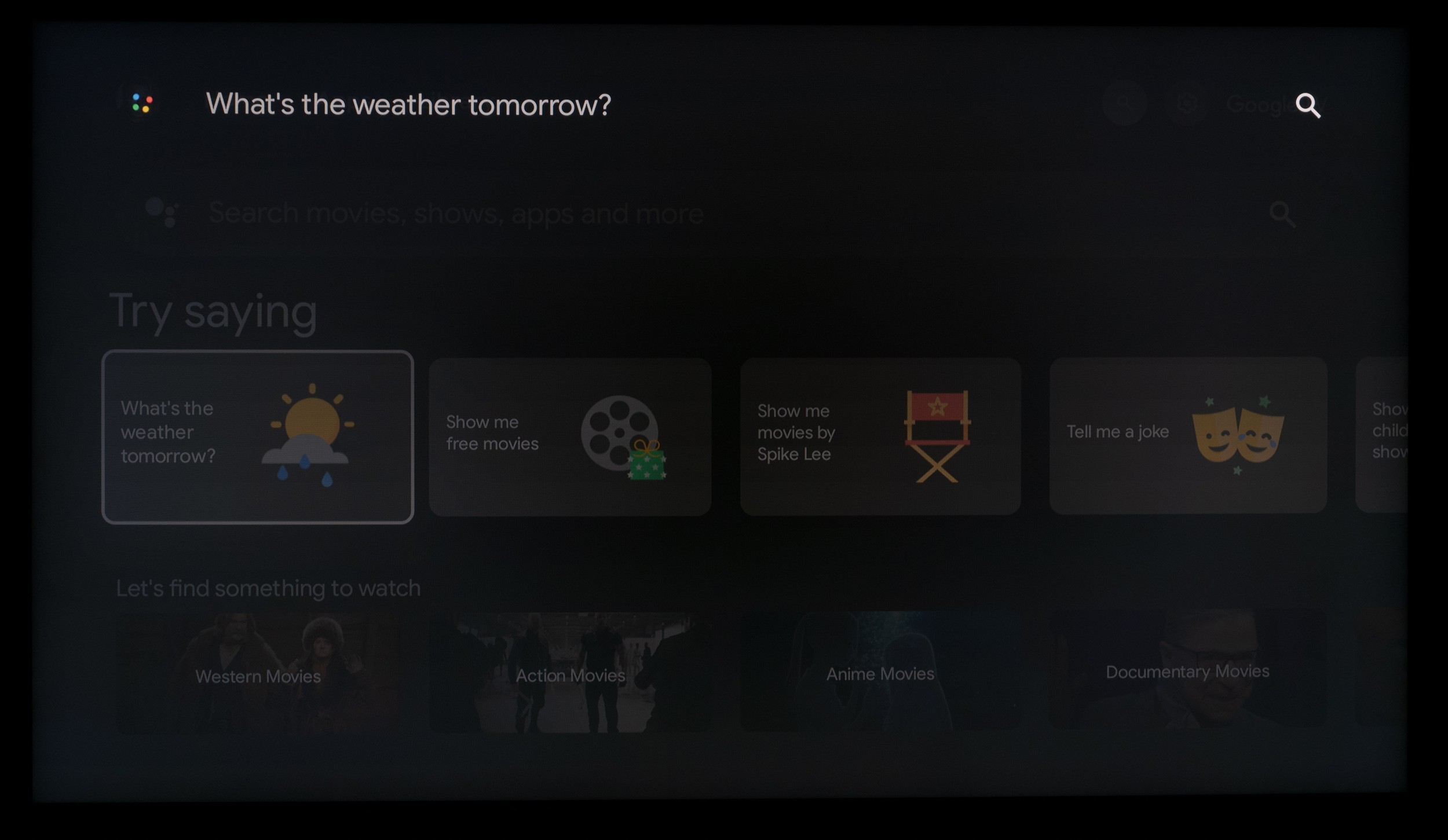 В передней части пульта рядом с индикатором есть отверстие микрофона. Голосовой помощник Google запускается при нажатии на кнопку с разноцветным микрофоном (для ввода голосовой команды держать ее не нужно), также его можно запустить с домашней страницы или нажатием на мультимедийную кнопку поиска на цифровой клавиатуре. Этот помощник поможет найти контент, который предоставляют ряд программ, и ответить на какие-то вопросы (показывает и проговаривает ответ), например, какая сейчас погода за окном. Пульт желательно держать поближе к себе, поскольку встроенный в пульт ДУ микрофон не является высокочувствительным.