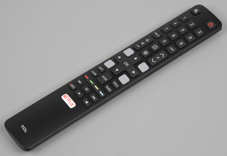 Корпус пульта изготовлен из пластика с черной матовой поверхностью. Обозначения кнопок достаточно крупные и контрастные. Отметим выделенную кнопку для запуска приложения Netflix. Практика показала, что пользоваться этим пультом относительно удобно. Работает пульт по ИК-каналу. К особенностям дизайна пульта относится отсутствие окошка спереди, ИК-диод светит прямо через переднюю стенку корпуса. Функции координатного ввода, например гироскопической «мыши», у штатного пульта нет. Ограниченные в случае такого «умного» телевизора возможности пульта можно компенсировать, подключив к телевизору клавиатуру и «мышь». Эти устройства ввода работают через USB-разветвитель, правда, из двух опробованных заработал только один. Одновременно через разветвитель можно подключать и USB-накопители. Возможно, с телевизором работают устройства ввода с интерфейсом Bluetooth, но мы это не проверяли. «Мышь» и клавиатура с некоторыми ограничениями работают в интерфейсе самого ТВ и в программах, но ввод текста с клавиатуры не работает, например, в YouTube. Задержка перемещения курсора мыши относительно движения самой мышью практически не чувствуется. В случае клавиатуры поддерживаются некоторые быстрые клавиши из основного и дополнительного мультимедийного набора (например, возврат/отмена, регулировка громкости, выключение звука, пауза/воспроизведение/запуск Time shift и т. д.), а также ввод номера ТВ-канала. С клавиатуры вводятся только заглавные латинские буквы, как сменить раскладку и регистр, мы не выяснили. Нужно отметить, что в целом интерфейс хорошо оптимизирован для использования только комплектного пульта ДУ, то есть подключать клавиатуру и «мышь», в общем-то, необязательно.